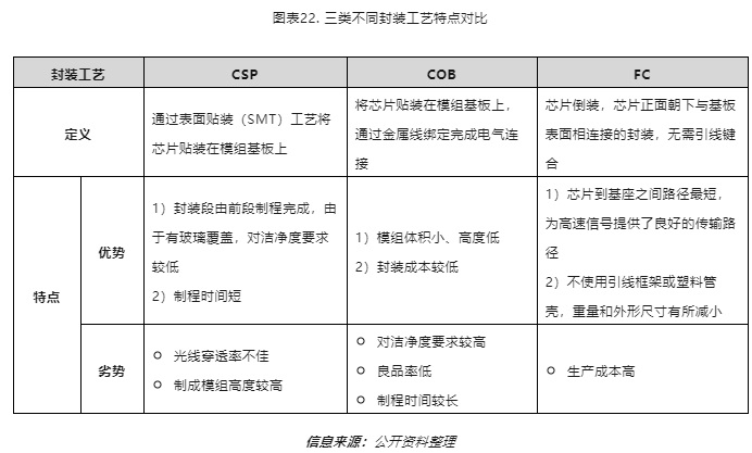 隨著車載攝像頭模組不斷地向高清化、小型化趨勢發(fā)展,車攝像頭模組封裝工藝也在逐步升級。目前,車載攝像頭模組還是以CSP封裝模式為主,即通過表面貼裝(SMT)工藝將芯片貼裝在模組基板上。綜合技術(shù)需求和成本因素的考量,對于5MP及以上的高分辨率攝像頭,車載攝像頭模組廠商會逐步采用通過金屬線綁定將芯片貼裝在模組基板上的COB封裝技術(shù)。