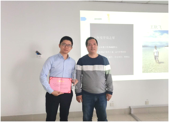 (從左向右)“年度學(xué)員之星”王秋飛、頒獎人劉正山