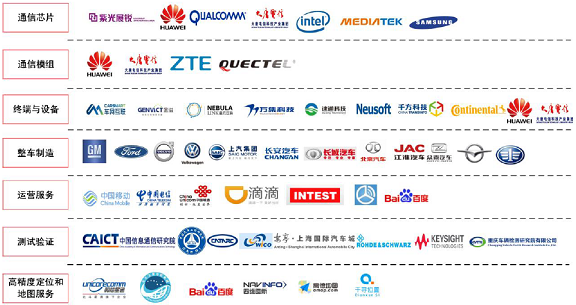 C-V2X產(chǎn)業(yè)鏈從狹義上來說主要包括通信芯片、通信模組、終端與設(shè)備、整車制造、測(cè)試認(rèn)證以及運(yùn)營服務(wù)等環(huán)節(jié)。