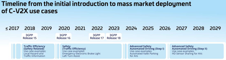 可以看到繼2020年C-V2X第一階段LTE-V2X部署應(yīng)用,未來3-4年是一個(gè)發(fā)展階段。同時(shí),針對(duì)增強(qiáng)安全應(yīng)用和自動(dòng)駕駛,業(yè)界預(yù)計(jì)將于2024-2027年開始商用部署。