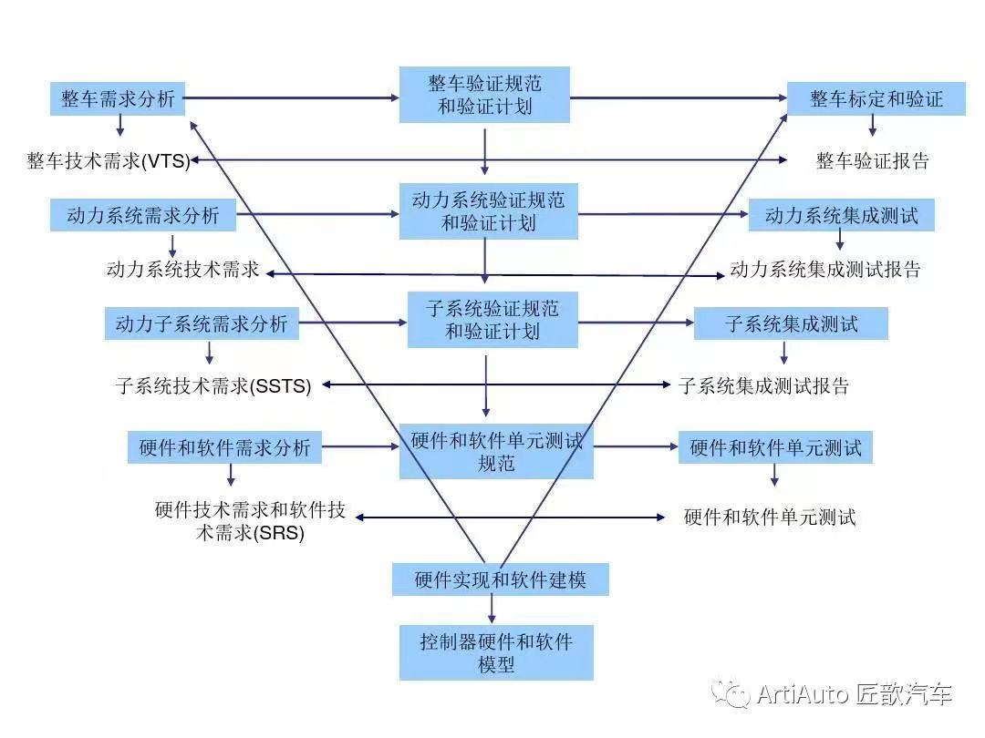 V流程來(lái)源于軟件開(kāi)發(fā)過(guò)程中一個(gè)稱為快速應(yīng)用開(kāi)發(fā)的模型,由于該模型的構(gòu)圖形似字母V,所以俗稱V模型。V模型是軟件開(kāi)發(fā)、測(cè)試中最重要的一種模型,其大體可劃分為幾個(gè)不同的階段步驟,即功能需求、功能開(kāi)發(fā)、軟件開(kāi)發(fā)、軟件集成測(cè)試、功能集成測(cè)試、整車集成測(cè)試(系統(tǒng)合格性測(cè)試),如上圖所示。左邊為需求分析和設(shè)計(jì)開(kāi)發(fā)的過(guò)程,右邊則為針對(duì)左邊的測(cè)試驗(yàn)證。