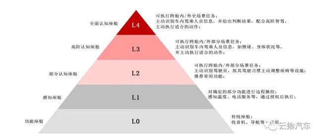 按其實現(xiàn)的能力對智能座艙進行分級,從人機交互、網(wǎng)聯(lián)服務、場景應用與拓展三個維度進行劃分,將其分為L0-L4這五個層級。