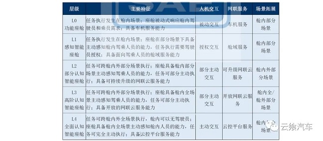 在業(yè)內(nèi)相關(guān)機構(gòu)的聯(lián)合牽頭下,其對智能座艙進行了分級,此雖并非行業(yè)標準但該舉措對于量化智能座艙的功能、統(tǒng)一并提升相關(guān)企業(yè)的開發(fā)水平有著一定作用。