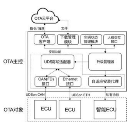 ② 車(chē)輛控制:對(duì)于影響車(chē)輛安全的升級(jí),整個(gè)升級(jí)過(guò)程需要保持在一種安全狀態(tài),因此, OTA 主控需要具備一定車(chē)輛功能控制能力,根據(jù)不同的升級(jí)類型,控制車(chē)輛的功能狀態(tài)。