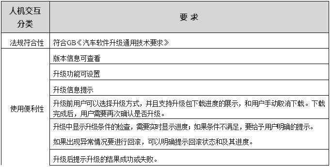 車(chē)端的人機(jī)交互主要體現(xiàn)在信息娛樂(lè)系統(tǒng)上,覆蓋到 OTA 的整個(gè)過(guò)程,包括信息提示、用戶確認(rèn)、關(guān)鍵信息顯示等。人機(jī)交互過(guò)程需要考慮的要素大致可以分為兩個(gè)方面,即法規(guī)符合性和使用便利性,如表 2-8 所示。