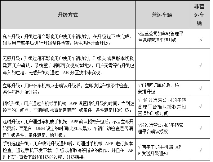 基于實(shí)際業(yè)務(wù)要求,各家 OEM 的 OTA 人機(jī)交互方式各有差異,本節(jié)共總結(jié) 6 種主流升級(jí)方式,并針對(duì)營(yíng)運(yùn)車(chē)輛與非營(yíng)運(yùn)車(chē)輛使用性質(zhì)不同,分別展開(kāi)分析,具體如表 2-10 所示。